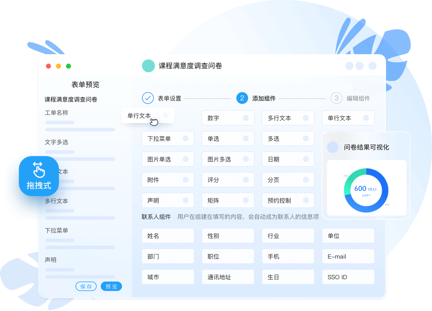 可拖拽式生成各類表單,滿足高校問卷、活動報名、投票等各類有關數(shù)據(jù)采集業(yè)務需求