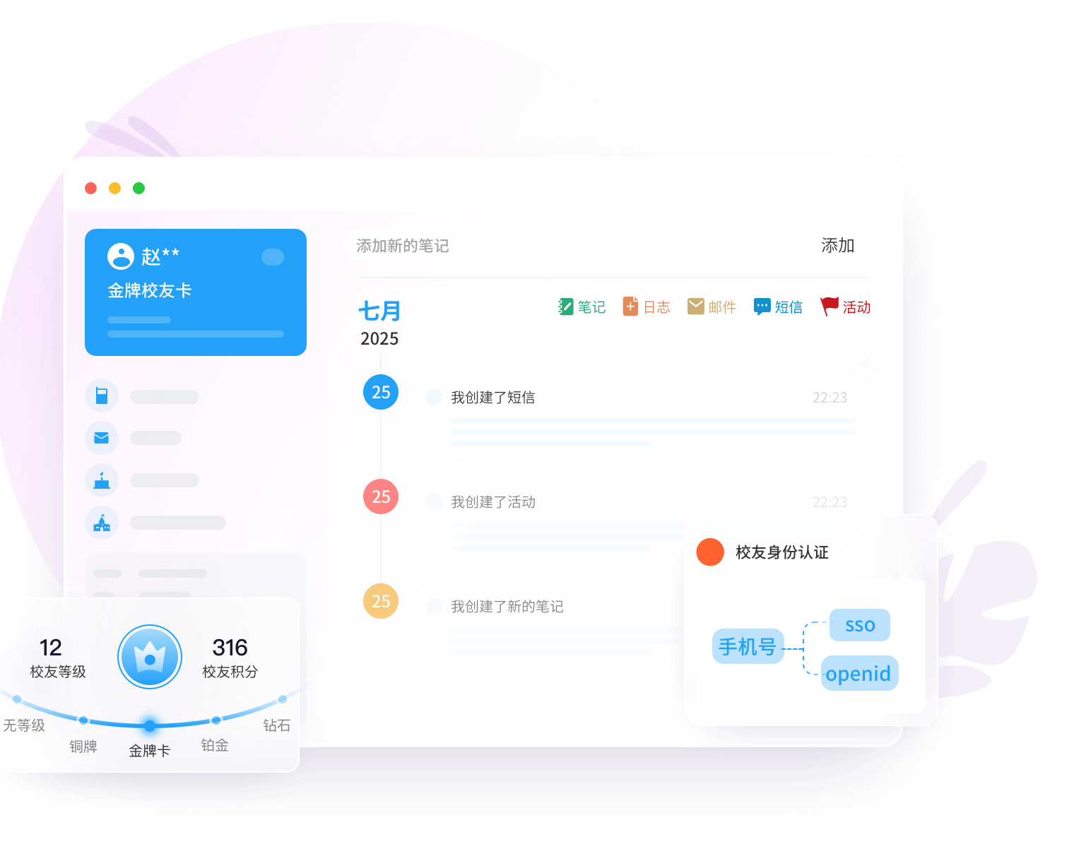 平臺支持接入微信、SSO、手機號等多重身份體系,為教育機構快速搭建師生、校友服務系統(tǒng),包含用戶注冊、信息管理、積分、用戶等級等。